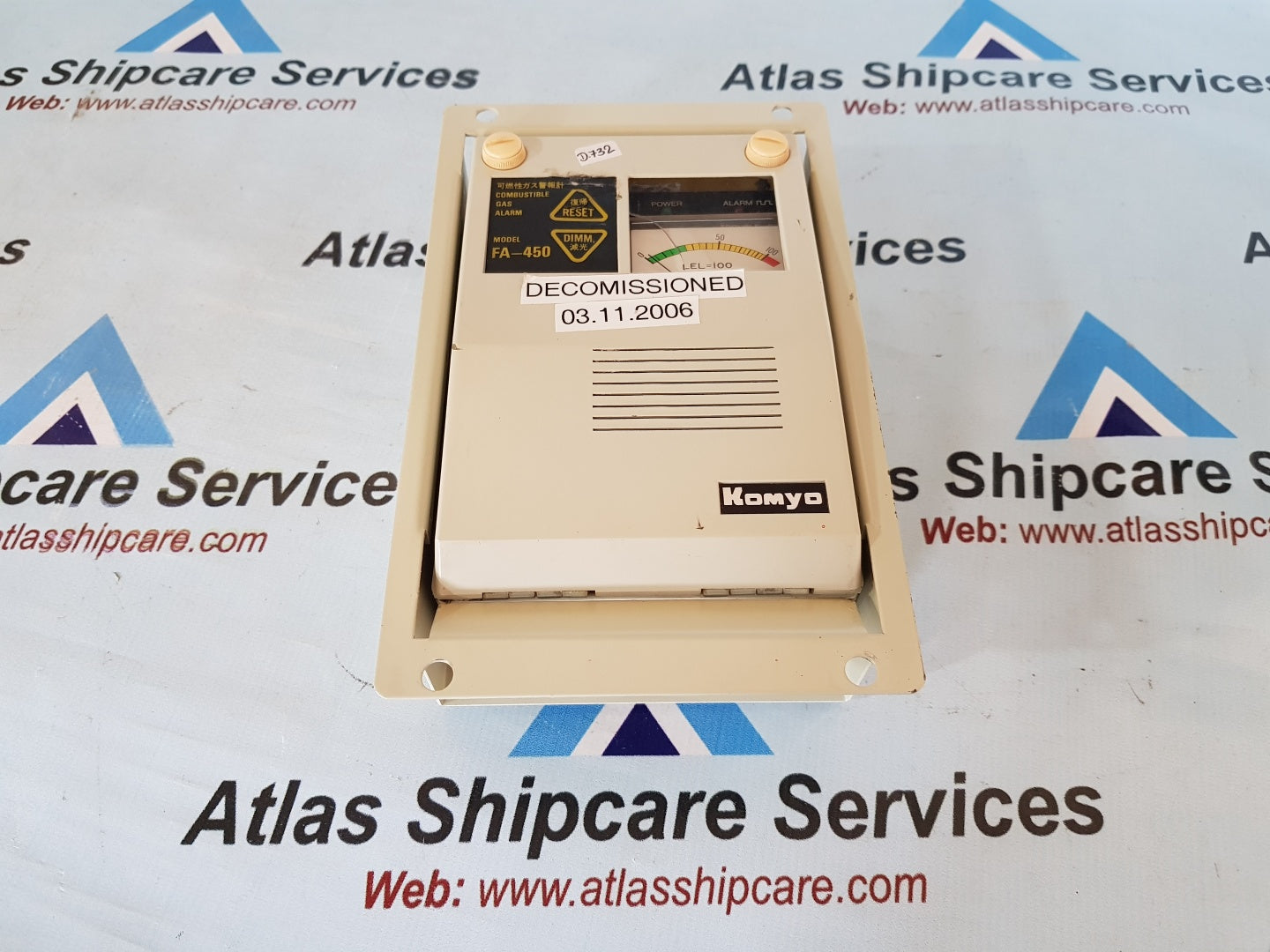 Regular price Rs. 0.00Sale price Rs. 0.00 Regular priceUnit price perSale Sold outKOMYO FA-450 COMBUSTIBLE GAS ALARM KOMYO RIKAGAKU KOGYO K.K. MODEL : FA-450 COMBUSTIBLE GAS ALARM DECOMISSIONED 03.11.2006 SER.NO : 1167 MFG.DATE : JUN.1991 CONDITION : USED...