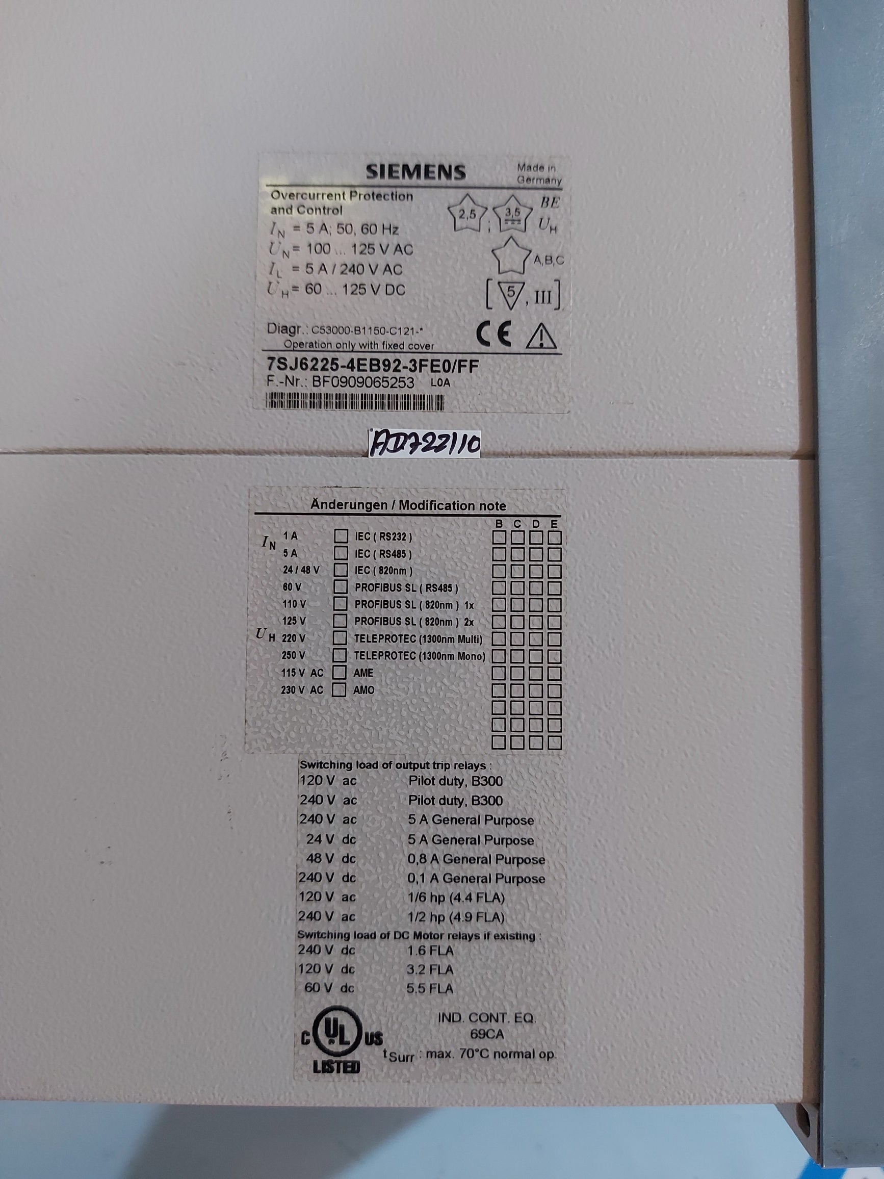 SIEMENS SIPROTEC 7SJ6225-4EB92-3FE0/FF OVERCURRENT PROTECTION AND CONTROL